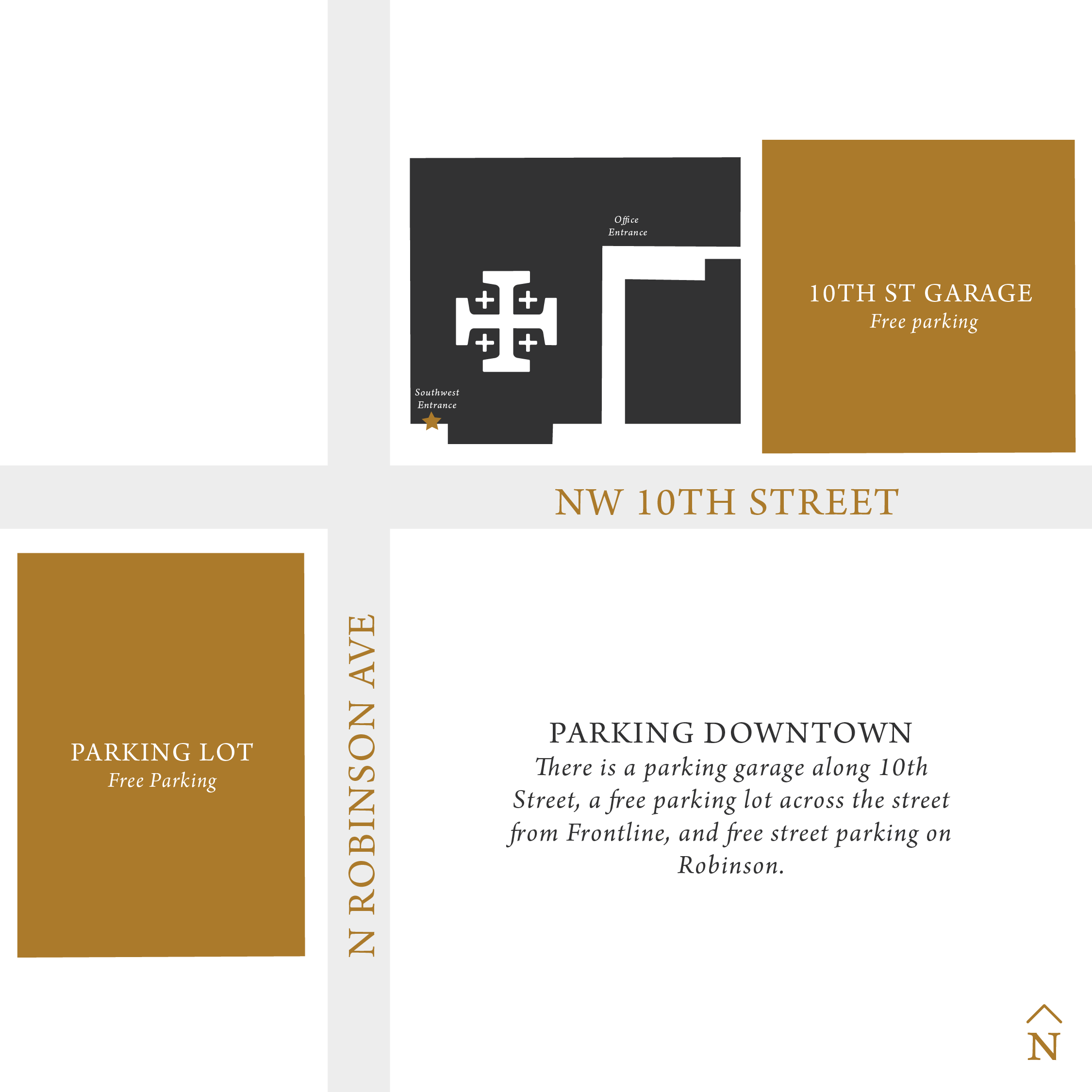 The parking garage on the East side of the Frontline Downtown building is FREE this week. You may park anywhere inside the garage at no cost. You may also park in the lot to the SW of the building. Street parking is available as well.